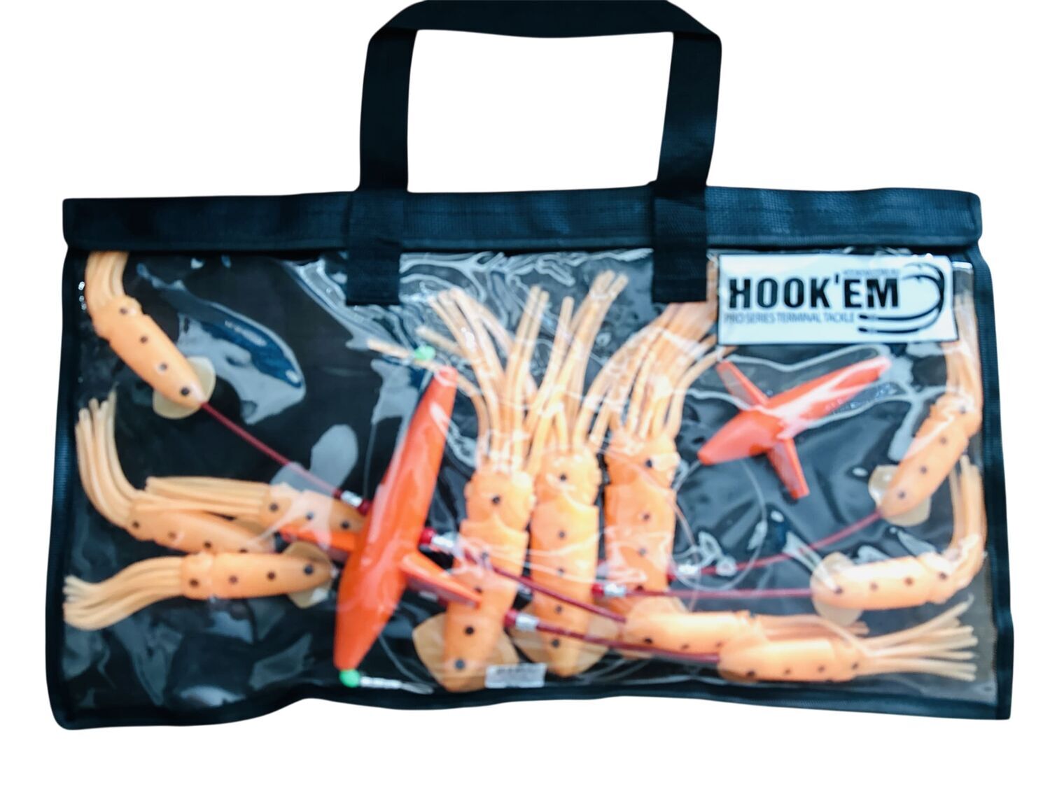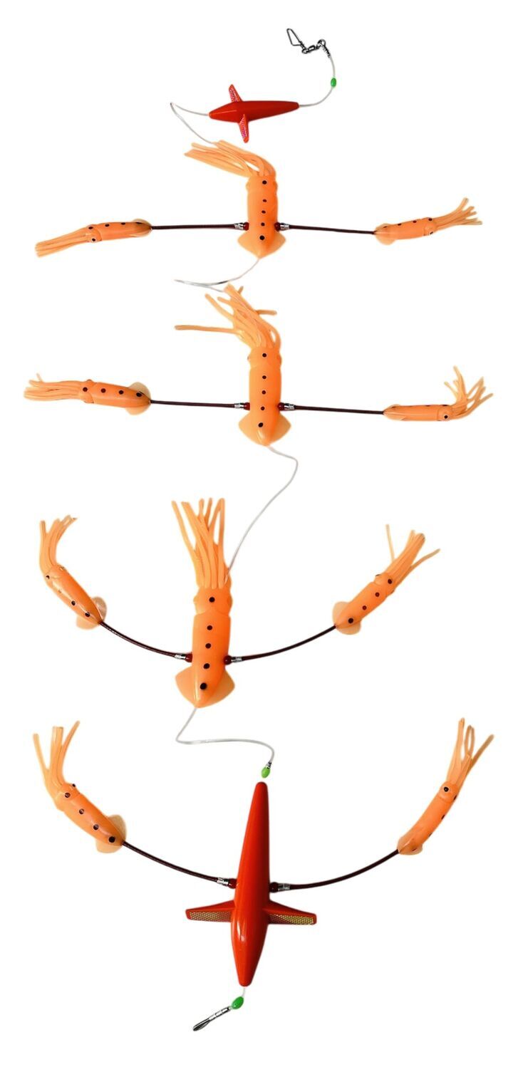 The Hookem Surface Teaser creates commotion in the water to attract a variety of pelagic species, particularily tuna and marlin. These teasers feature rubber squid and bird attractors, proven to entice game fishing species. Each design features 3 large squid, 6 smaller squid and 2 birds (small and large). Full length: 180cm